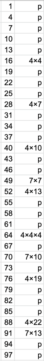 この「3の倍数+1世界」における素因数分解を一覧にしてみたのが以下です。範囲は1から97まで、「p」はそれ以上「3の倍数+1の数」の積に分解できない"素数"を表します。