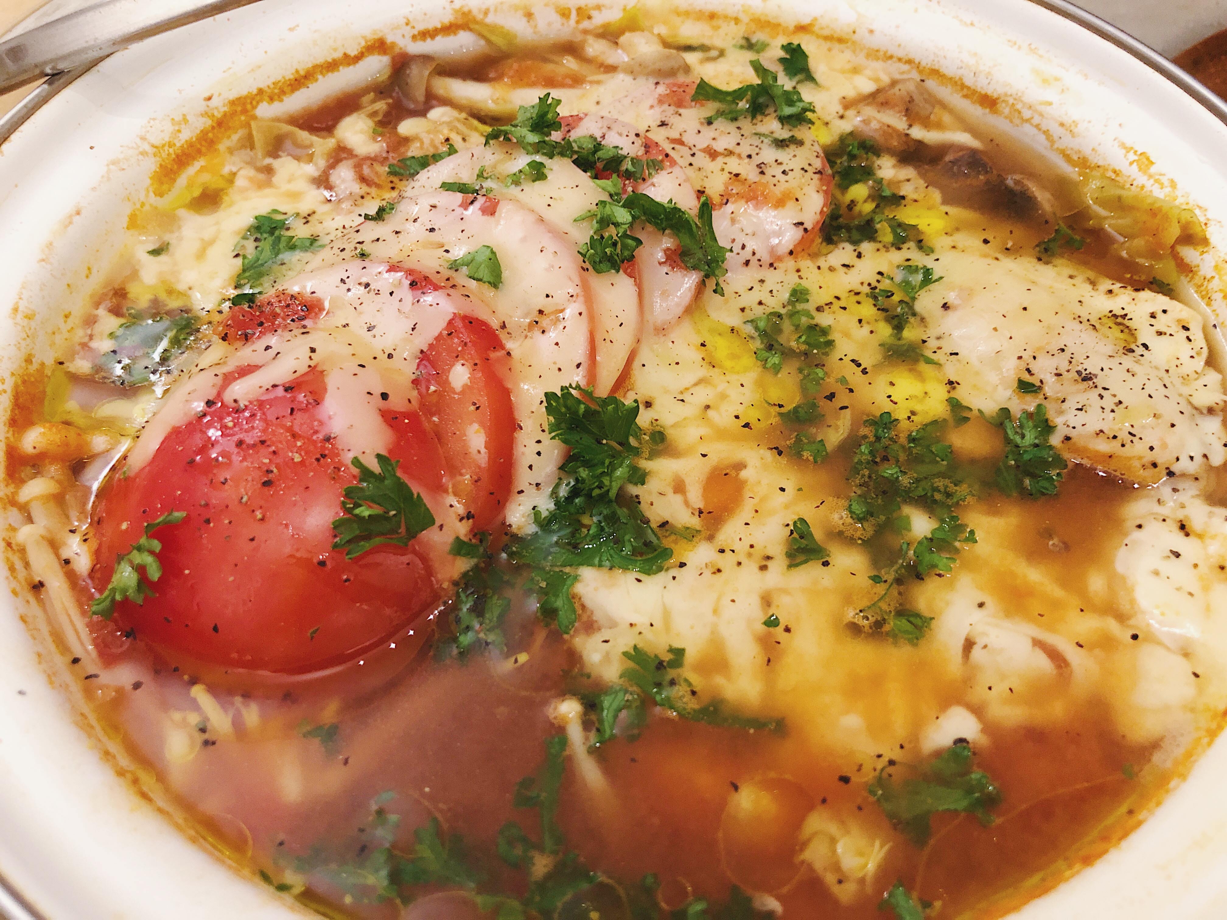 コンソメや塩で作ったスープに潰したトマト、鶏肉、鱈、海老などを入れてトマト鍋を作ったという eriko